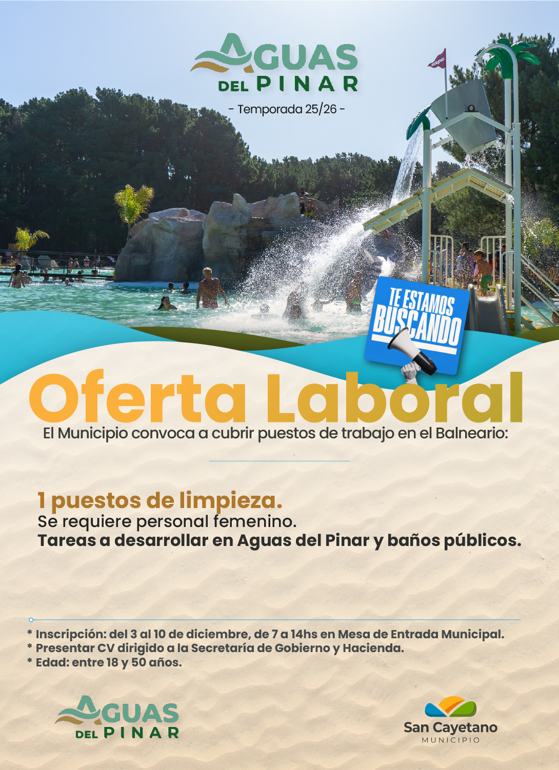Se busca cubrir 1 puesto de limpieza (personal femenino) para tareas en Aguas del Pinar y baños públicos.