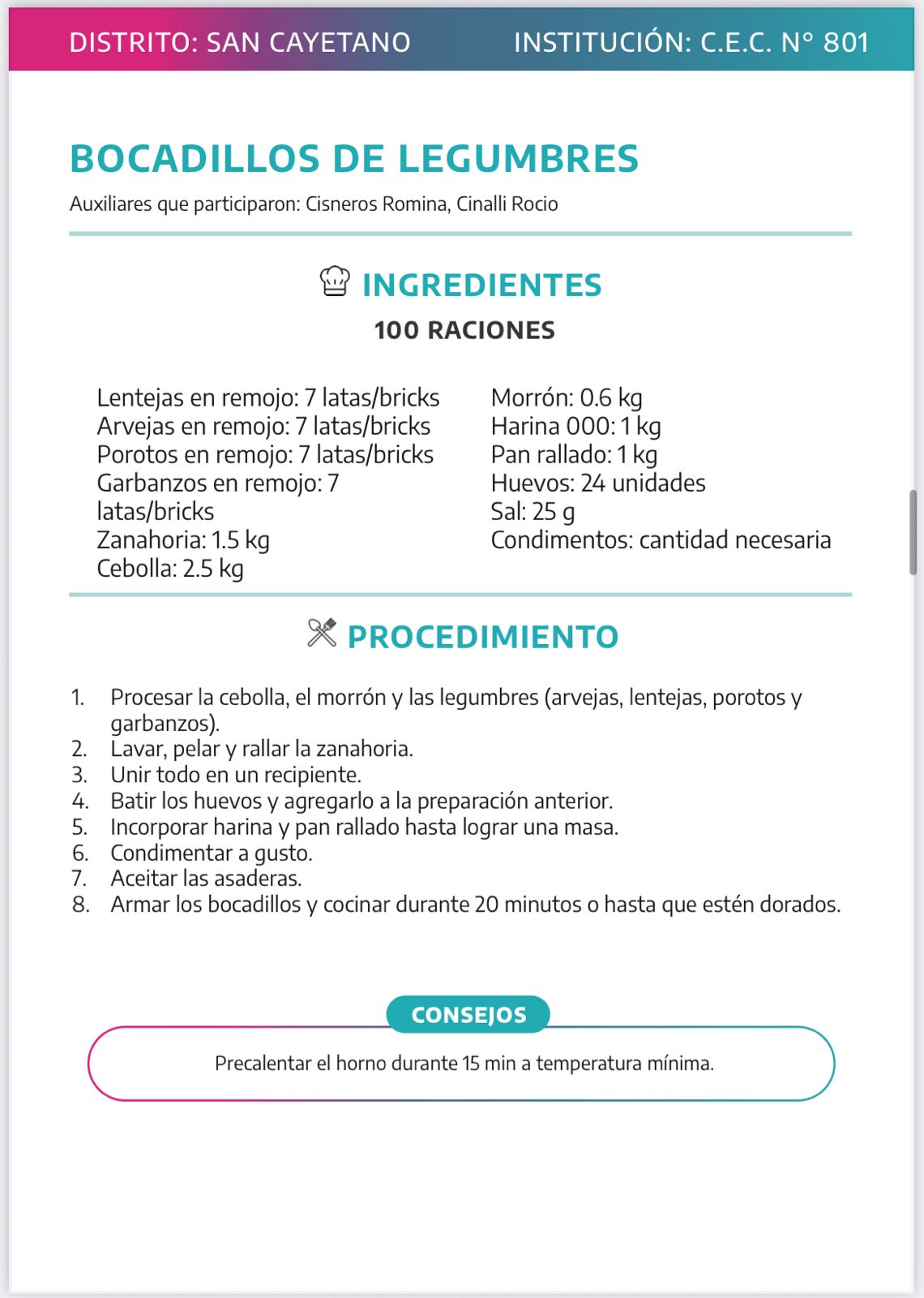 Julieta Beaín fue acompañada por Romina Cisneros, auxiliar del Centro Educativo Complementario Nº 801, quién participó en la creación de la receta correspondiente a nuestro municipio.