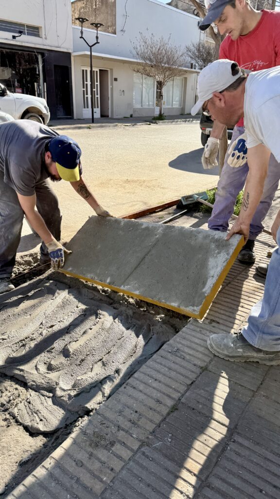Estas nuevas rampas, elaboradas con premoldeado, llevan grabado el nuevo escudo del Partido de San Cayetano, símbolo de identidad y pertenencia. Avance firme hacia una ciudad más inclusiva.